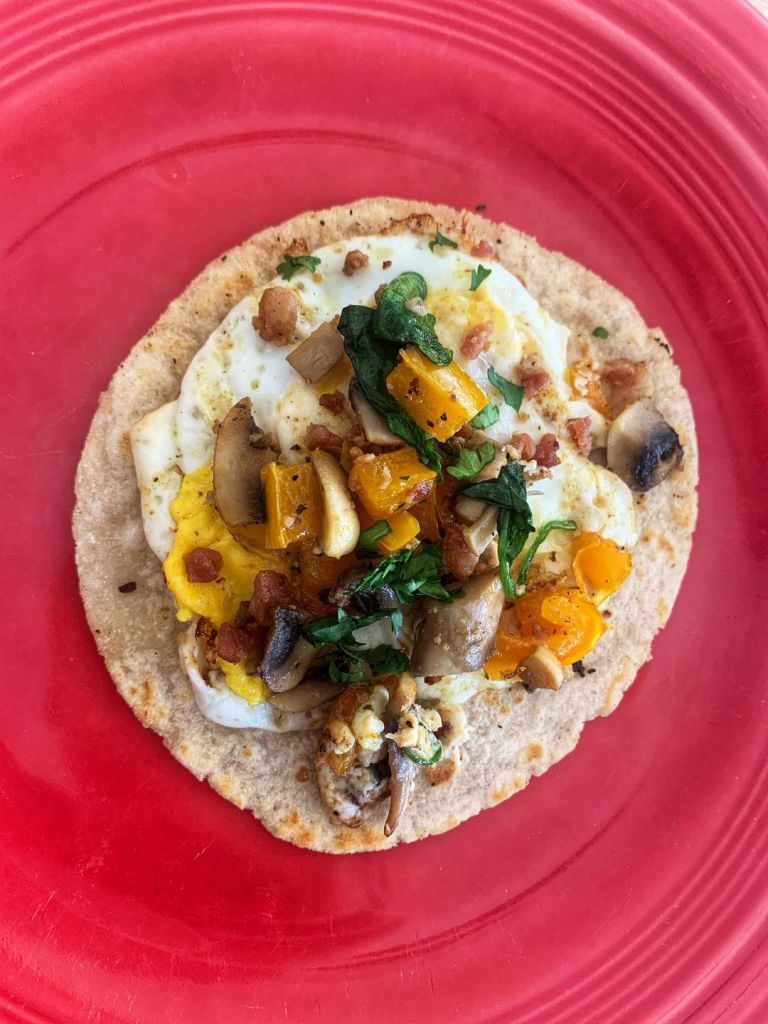 I’m gluten free so I only use corn tortillas- they are best when you throw them on your frying pan to heat (after your veggies and eggs are done) for a minute! #LifeHack #OnePanWonder